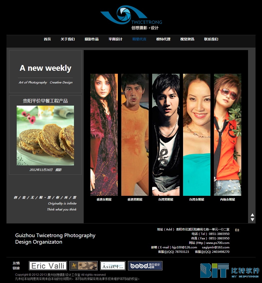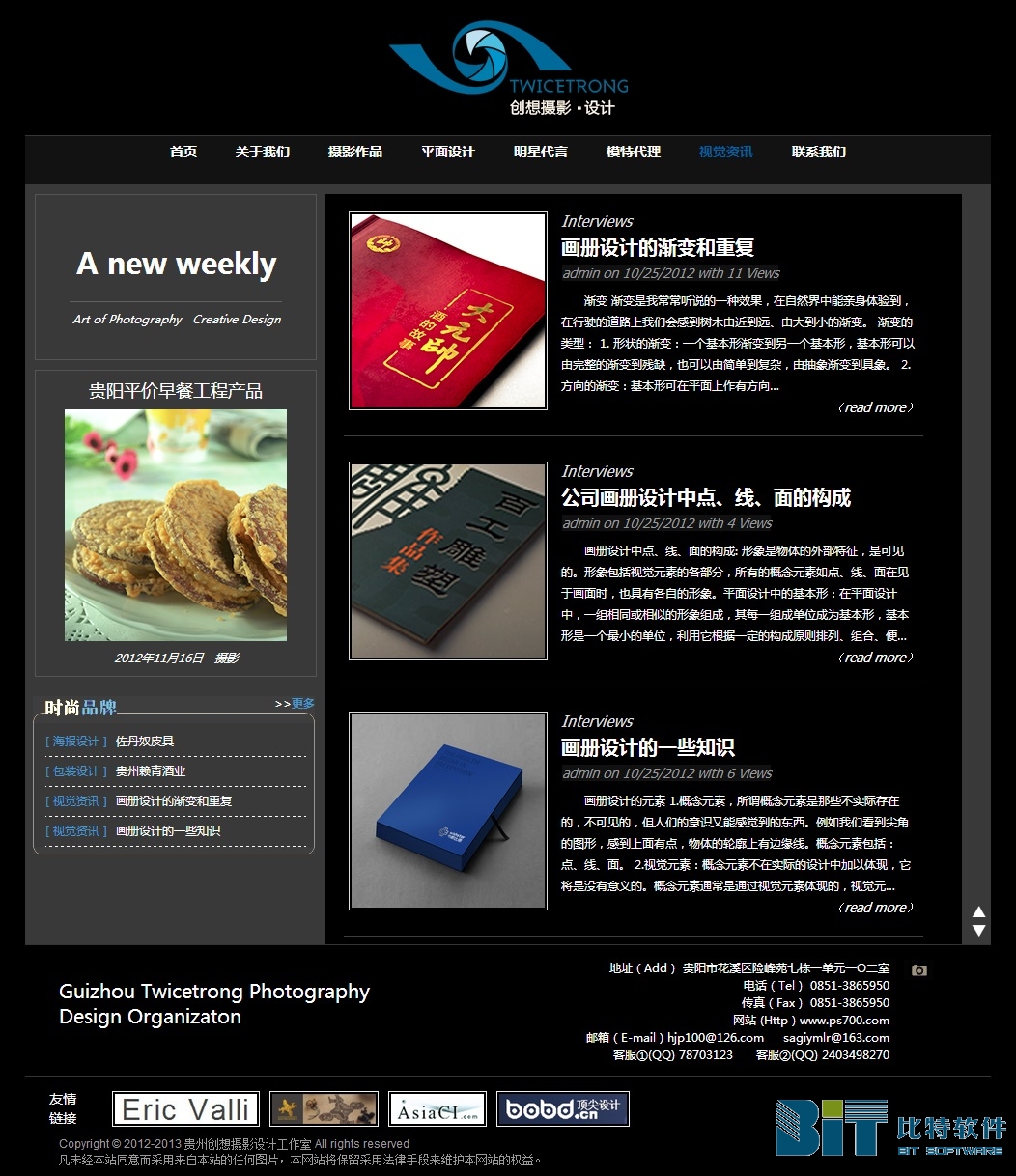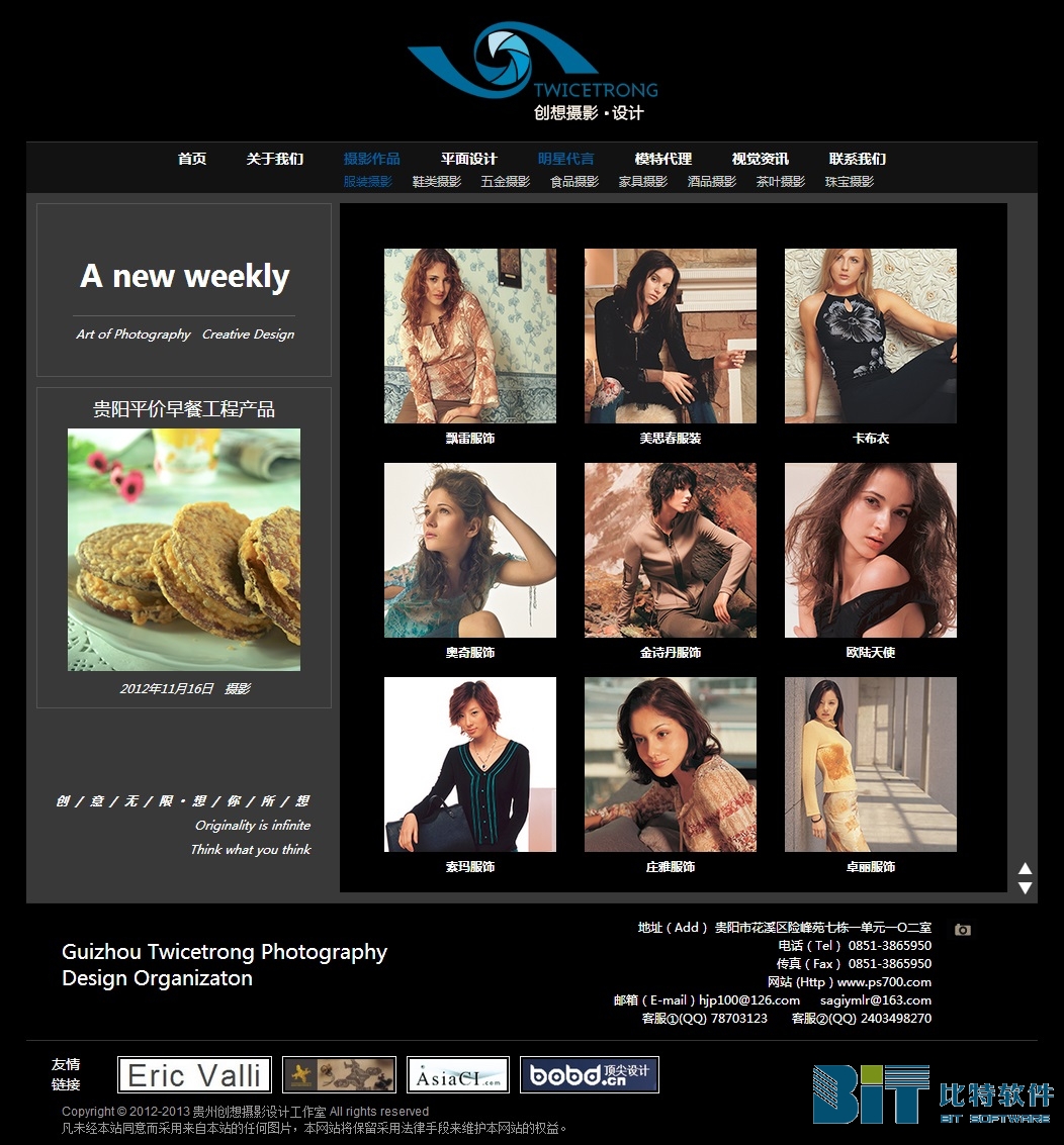 案例名称:贵州创想摄影设计工作室 主办单位:贵州创想摄影设计工作室 案例地址:# 平面设计:贵州比特软件有限公司 所属行业:摄影设计 上线时间:2012/10/03 案例简介:创想是一个专门为客户精心打造以视觉感受展现自己的专业广告摄影团队,可以为你提供淘宝摄影,食品摄影,时装摄影,产品摄影,商业摄影,LOGO设计,包装设计,画册设计等商业服务。 案例赏析